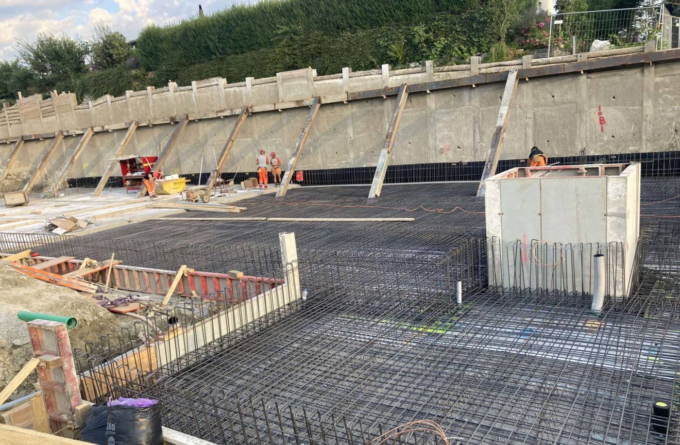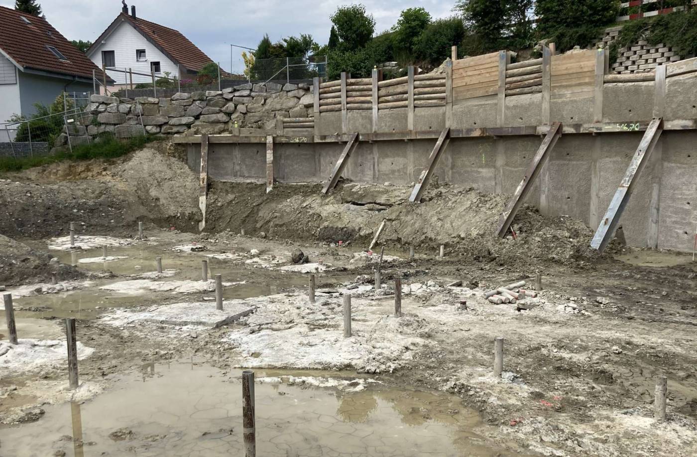 Bei diesem spannenden Projekt im Wohngebiet Schönbühl in Emmenbrücke wurden zwei Mehrfamilienhäuser mit einer gemeinsamen Einstellhalle gebaut. Die Baugrube wurde gegen die Nachbarsgrundstücke mit einer in die Baugrube gespriessten Rühlwand gesichert, an welche das Gebäude anschliessend einhäuptig betoniert wurde. Da die Baugrubensohle teilweise auf dem Felsen, zum Teil auch deutlich darüber zu liegen kam, waren für die Fundation durch den unterschiedlichen Felsverlauf Injektionsrammpfähle notwendig.