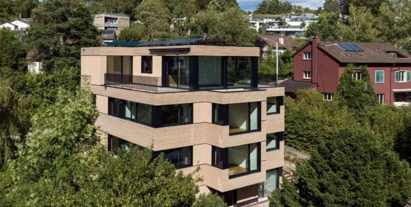 Wohnhaus mit fünf Geschossen und belüfteter Holzfassade.