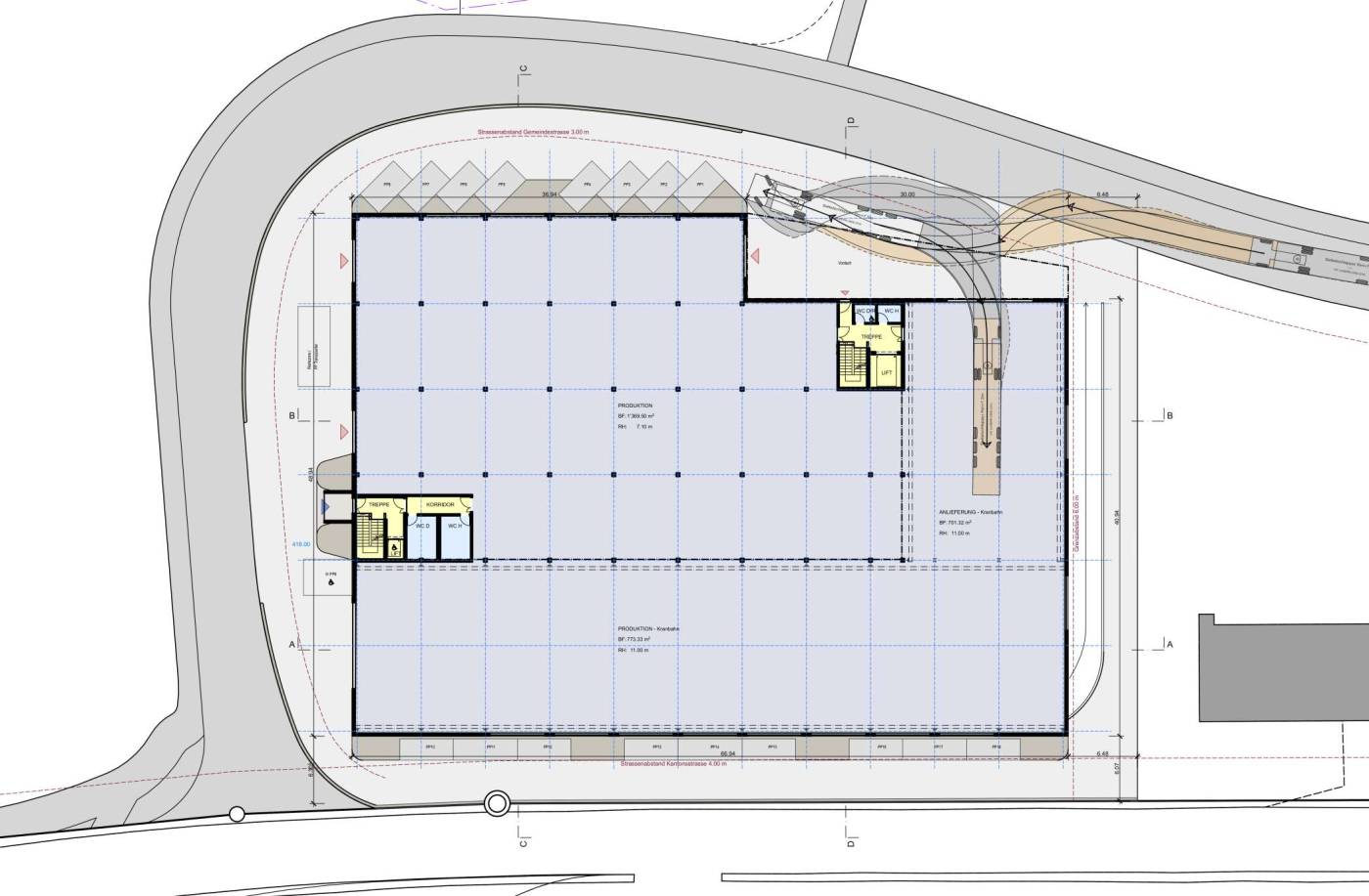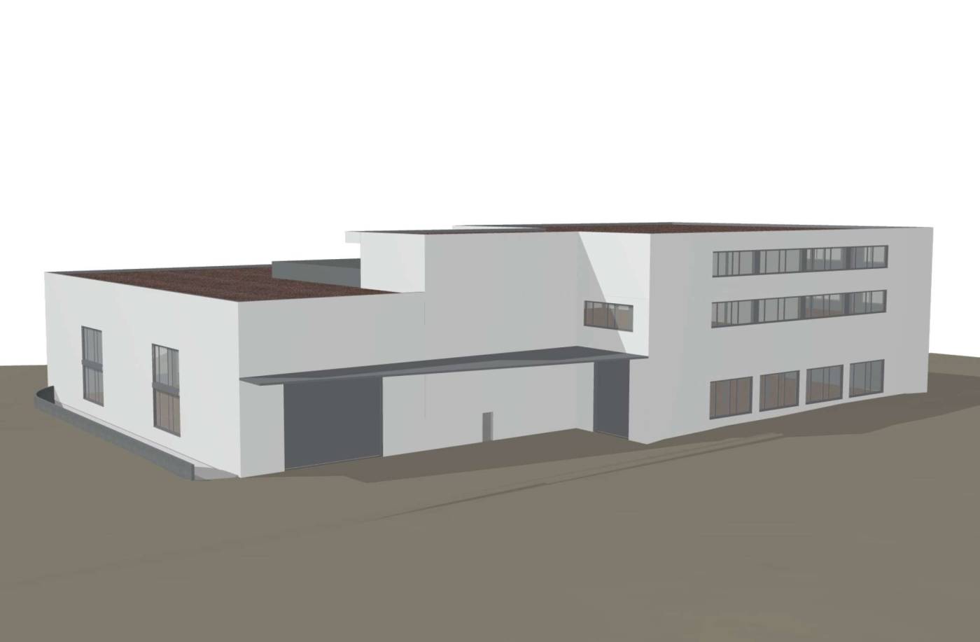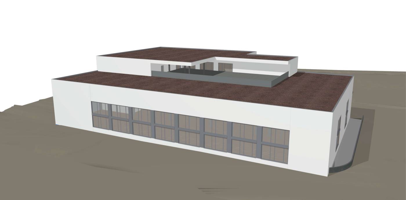 Nach einer Machbarkeitsstudie wurde für das industrielle Produktionsgebäude ein Richtprojekt erarbeitet. Die grosse Produktionsstätte ist L-förmig angeordnet und in Leichtbauweise vorgesehen. Die Kernzone mit weiteren Produktionsflächen, Lager, Büro und Gastroräumlichkeiten ist in Massivbauweise konzipiert. Das ganze Gebäude weist zudem eine vollflächige Unterkellerung mit Tiefgarage auf.