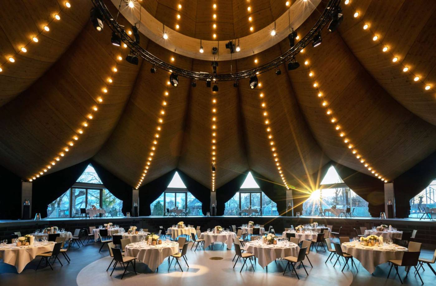 Das freitragende Zeltdach in Holzbauweise ist als Schalenfaltwerk konzipiert. Ein Ring aus schlaff bewehrtem Stahlbeton leitet die Horizontalkräfte in die vor Ort vorfabrizierten Sichtbetonstützen ein. Das Sockelgeschoss in Massivbauweise steht auf Grund der Nähe zum See auf einer Pfahlgründung.