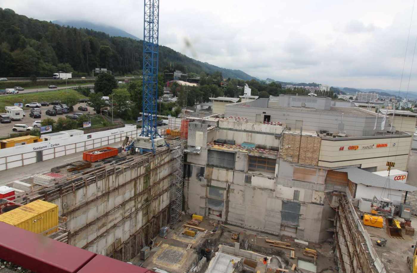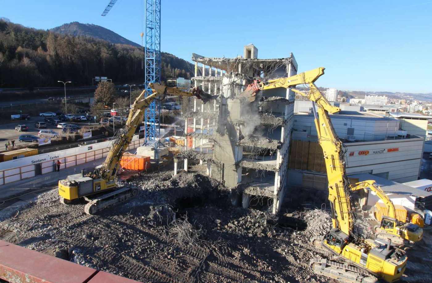Zu Beginn wurden ca. 4'000m3 Betonwände und -decken zerkleinert und abgeführt und eine 18m tiefe Baugrube ausgehoben.