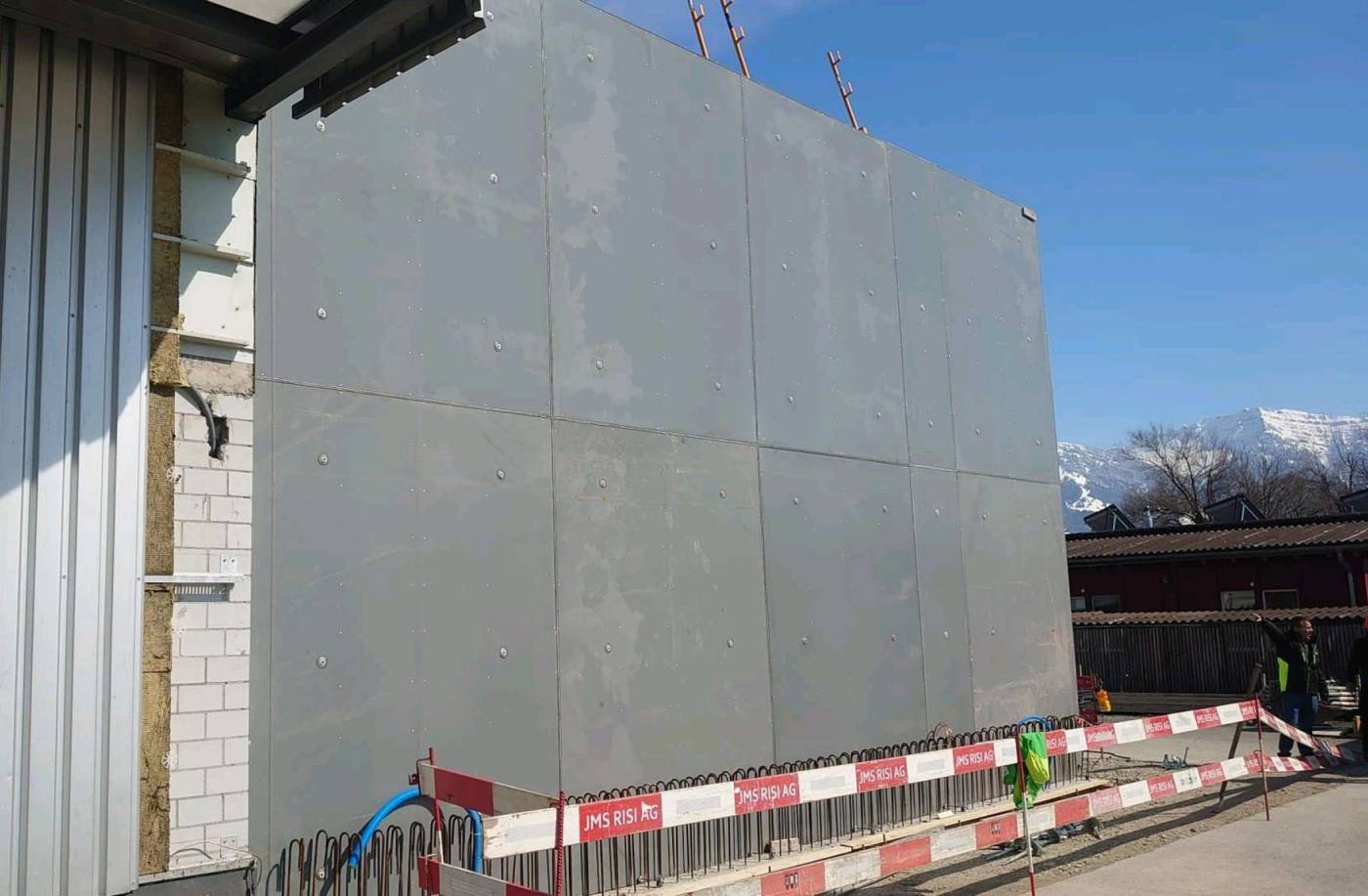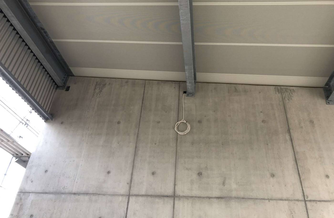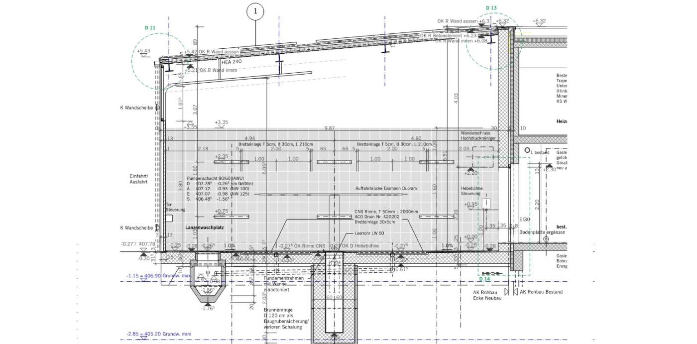Die neue Erweiterung der Garage und einer neuen Waschanlage ist infolge schlechter Baugrundverhältnissen auf Holzpfählen fundiert worden. Die Bodenplatte weist diverse Vertiefungen auf. Die bis zu 6m hohen freistehenden Sichtbetonwände wurden in der Höhe in einem Guss betoniert. Das Dach und eine Längsfassade wurden in Stahlbauweise erstellt.