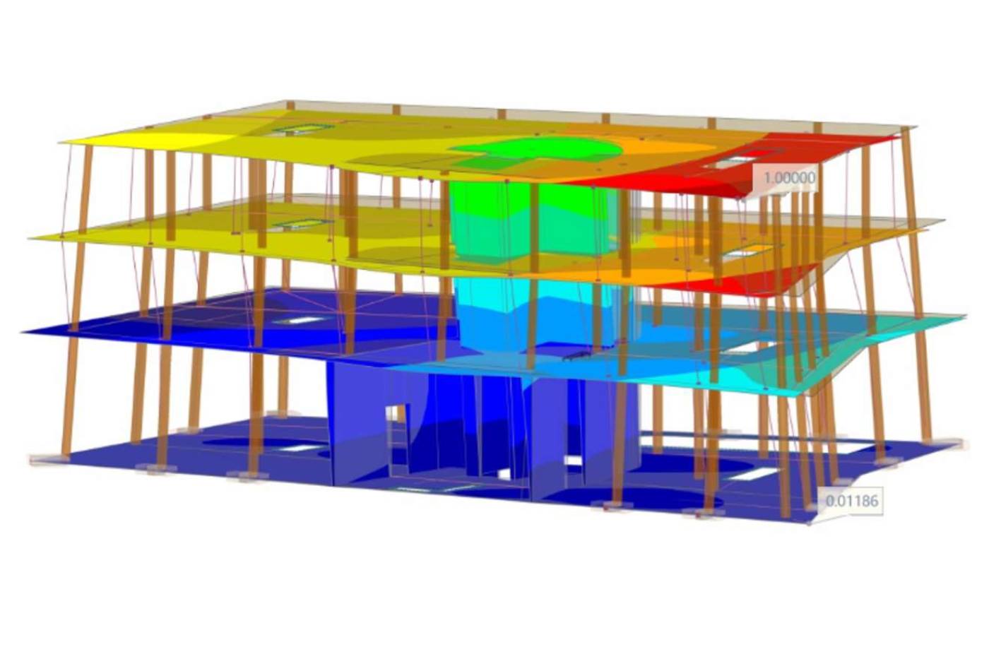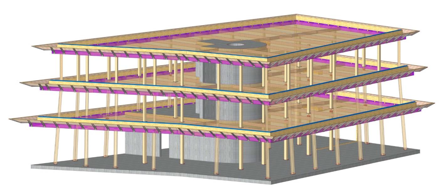Das dreigeschossige Gebäude wird in Holzbauweise errichtet und durch einen zentralen Stahlbetonkern stabilisiert. Die Geschossdecken aus CLT-Elementen werden dank TS3-Technologie biegesteif verklebt, wodurch eine schlanke Flachdecke entsteht, die ausschließlich von Holzstützen getragen wird.