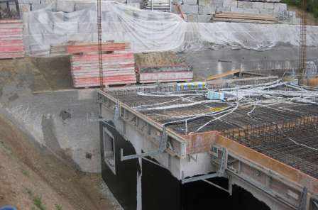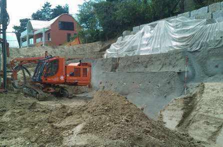 Für die Baugrube musste hangseitig eine vernagelte Spritzbetonwand zur Sicherung einer bestehenden Blocksteinmauer erstellt werden.