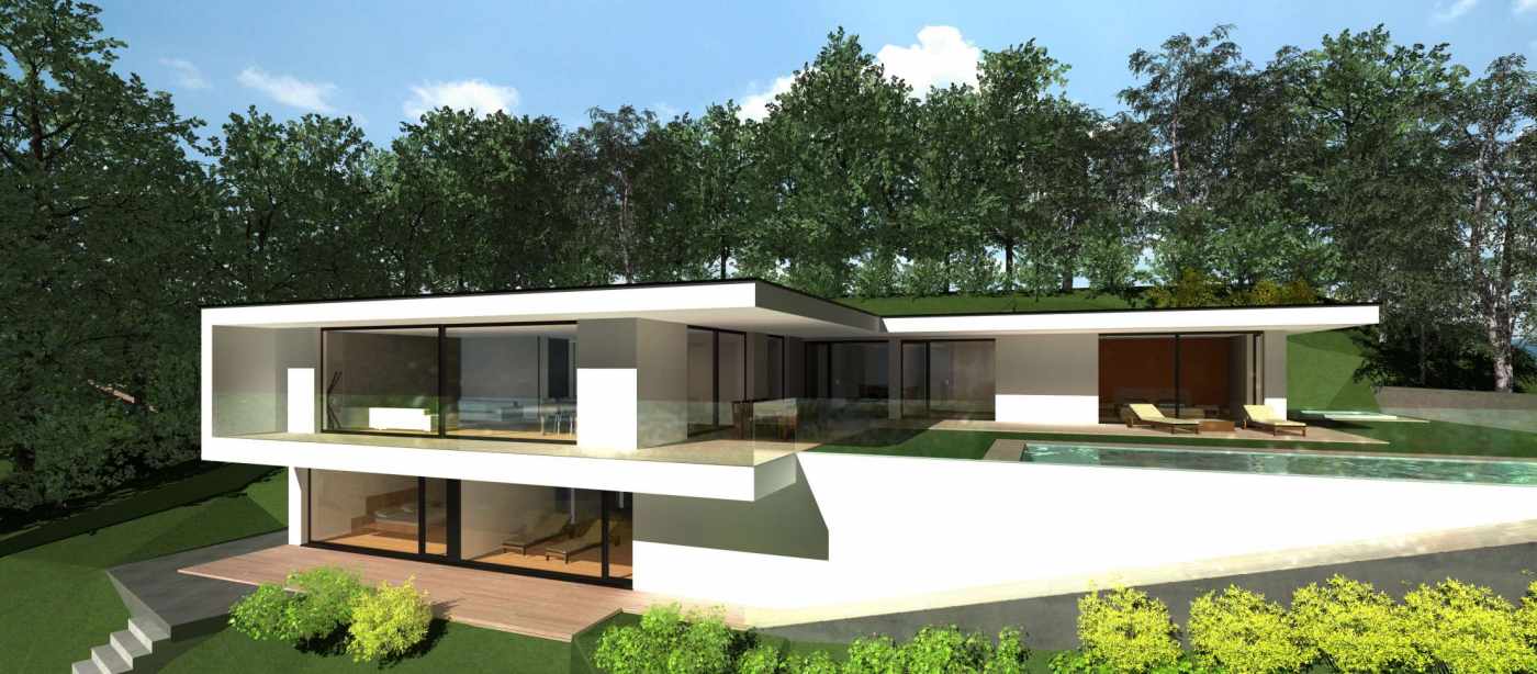 Bei dem Neubau handelt es sich um ein Einfamilienhaus in Massivbau bestehend aus einem Garagengeschoss, einem Untergeschoss sowie einem Erdgeschoss. Die Grundrissabmessungen im Erdgeschoss betragen zirka 24.5m x 23.5m.