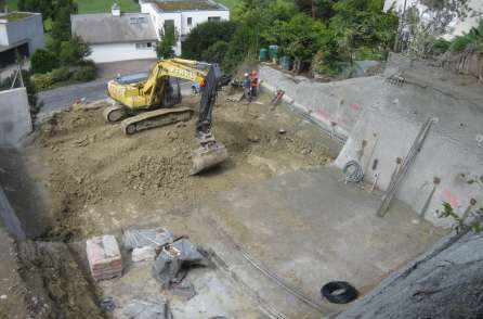 Der grosse Pool, welcher auf Höhe des Erdgeschosses liegt, wurde einseitig auf einer rund vier Meter hohen, durch Riegel verstärkten, bestehenden Stützmauer fundiert.