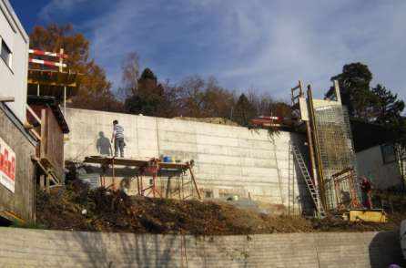 Die Baugrube, welche hauptsächlich im Fels zu liegen kam, wurde mit einer vernagelten Spritzbetonwand gesichert.