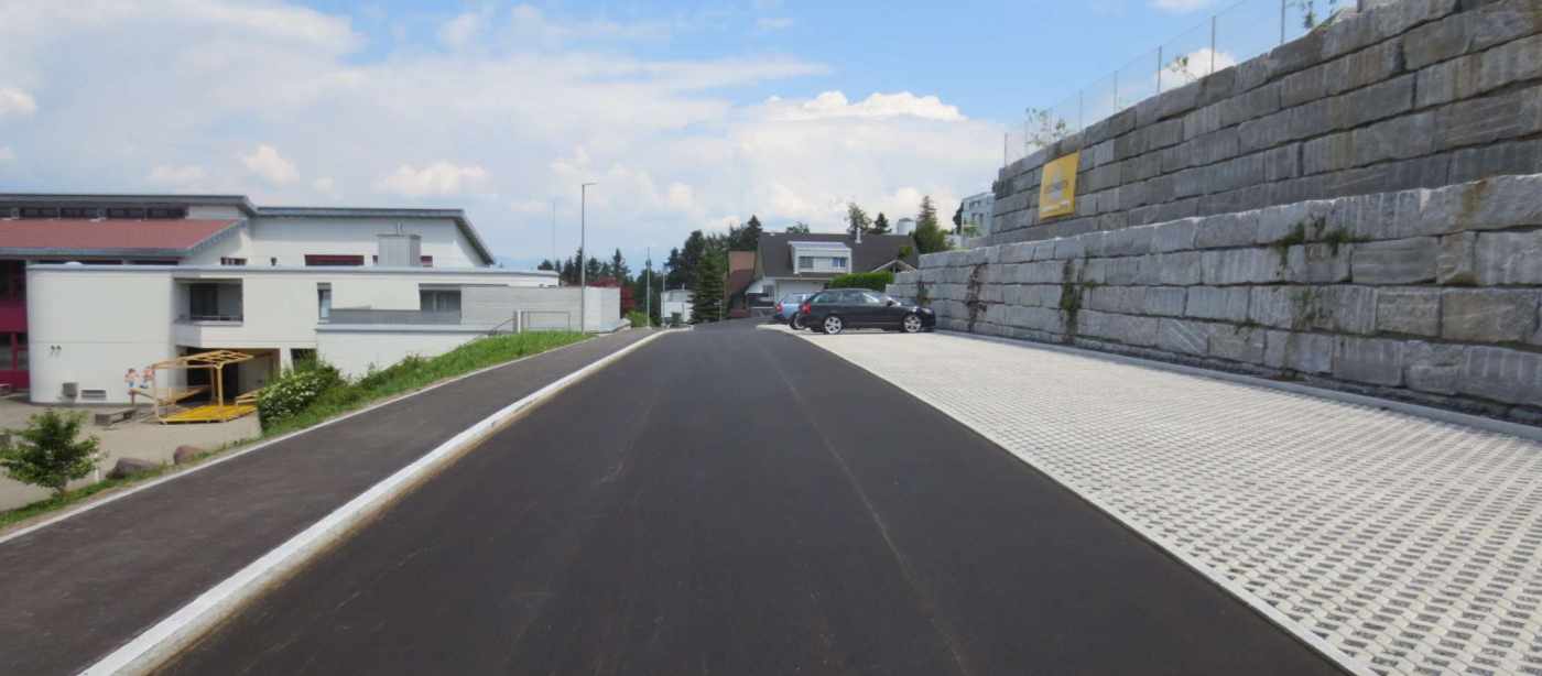Das Projekt Parkierung Schulhaus Feusisberg war ein Vorschlag zur Lösung der Parkplatzproblematik. Insgesamt wurden 29 neue, öffentliche Parkplätze mit einer Breite von 2.7m und einer Länge von 5m erstellt. Auf der Nordseite wurde die Schulhausstrasse mit einem 1.8m breiten Trottoir ergänzt. Damit kann die Schulwegsicherheit weiter verbessert werden. Um den notwendigen Platz zu gewinnen, wurde die bergseitige Böschung abgegraben und mit einer Granitquadersteinmauer gesichert. Dadurch konnte auch der Containerabstellplatz für die Schule optimiert werden.