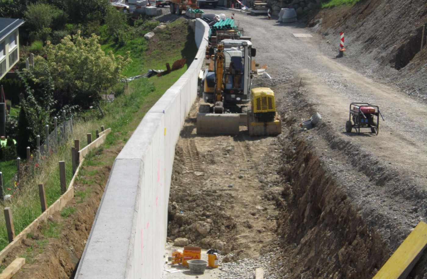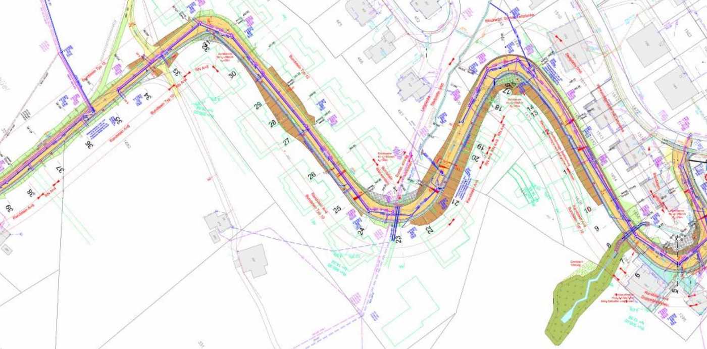 Das Gebiet Rahmensbüel wurde mit einer Groberschliessungsstrasse erschlossen, mit welcher zukünftig eine direkte Strassenverbindung des Pauligebietes mit dem Dorf möglich wäre. Die vertikale Linienführung wurde durch die vorhandene Topographie und Zwangspunkte von Seiten bestehender oder sich in Planung befindenden Hochbauprojekten bestimmt. Die Strassenbreite beträgt 5.40 m mit einem Trottoir von 1.50 m. Damit die Strasse realisiert werden konnte, waren Stützmauern erforderlich und ein Bachdurchlass musste erstellt werden. Die Entwässerung des Gebietes erfolgt im Trennsystem. Die Schmutz- und Meteorwasserleitung wurden im Zuge des Strassenbaus geplant und realisiert. Zudem wurden die übrigen Werkleitung (Wasser-, Gas-, Strom- und Medienleitungen) zusammen mit dem Strassenbau erstellt.