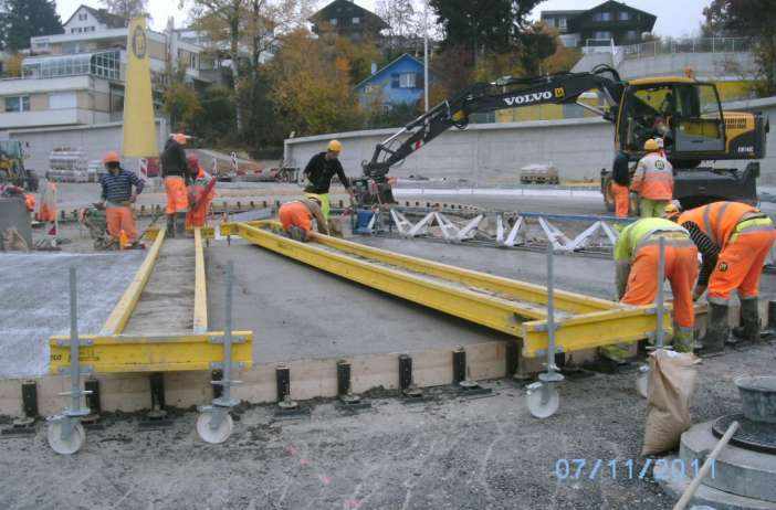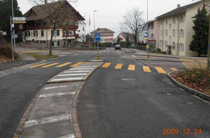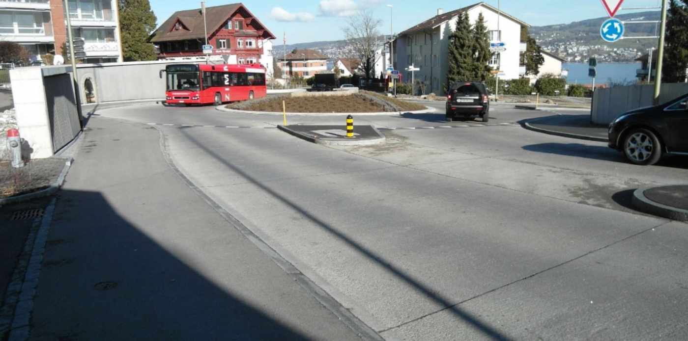 Aufhebung eines Unfallschwerpunktes Zugerstrasse / Waidlistrasse mit einem Kreiselneubau. Durch die starke Querneigung des Kreisels und dem starken Verkehrsaufkommen wurden die Kreiselfläche, Einmündungen und Bushaltestellen in Beton ausgeführt.