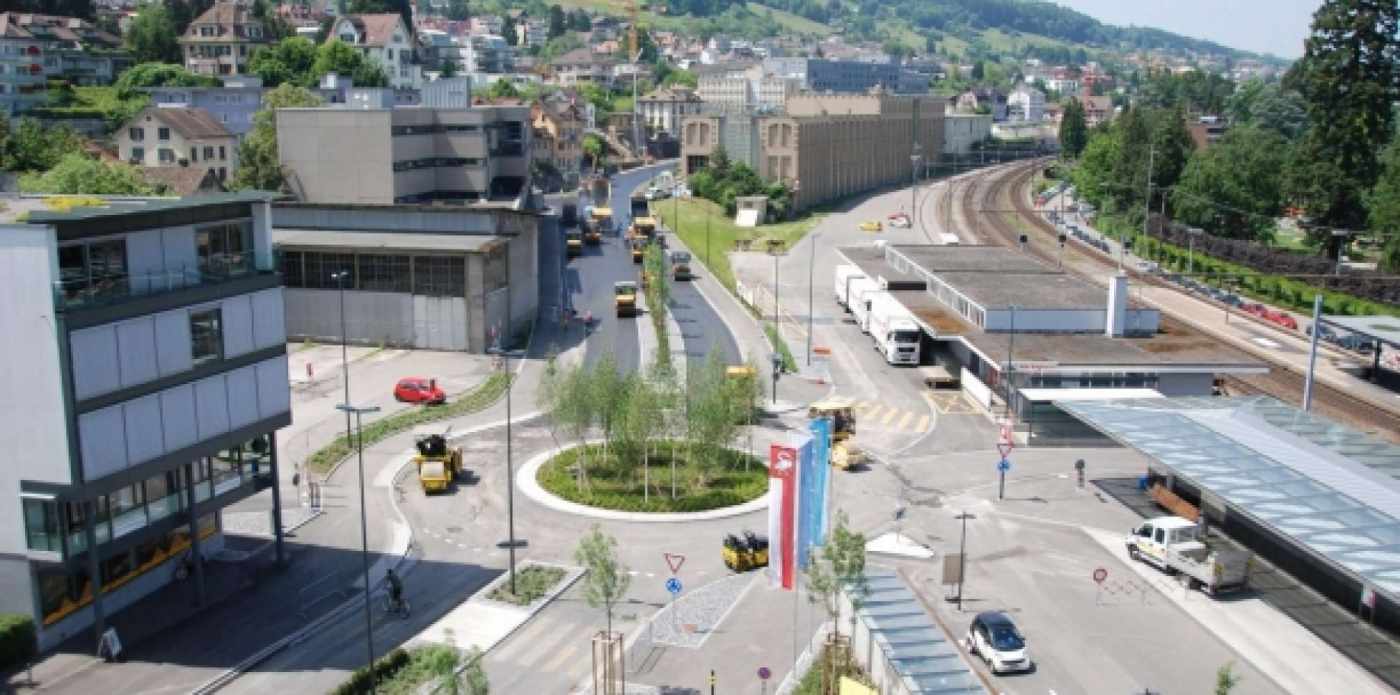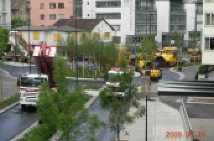 Aufgabenstellung: Umfassende Belagseinbauten von über 20000m2 mitten im Dorfzentrum, auf allen Verkehrsachsen, zu realisieren ohne dass der Verkehr zum Stillstand kommt. Lösung: Vollsperrung Dorfzentrum über ein Wochenende. Zwischen SA und MO wurde mit 14 Belagsfertigern auf allen Strassen gleichzeitig eingebaut, die Anpassungen und Markierungen ausgeführt. Da sämtliche Strassen im Zentrum nicht benutzbar waren, wurden für den ÖV prov. Buslinien und Haltestellen eingerichtet. Die frühzeitige Orientierung der betroffenen Bevölkerung erfolgte über Radio, Zeitung und Internet. Zusätzliche massgeschneiderte Orientierungsschreiben an die direkt betroffene Bevölkerung, Gewerbe, Notdienste etc. gewährten einen reibungslosen Ablauf. Die ganze Aktion wurde selbst von den stark betroffenen Anwohnern befürwortet und war im Endeffekt für alle ein riesen Erfolg.